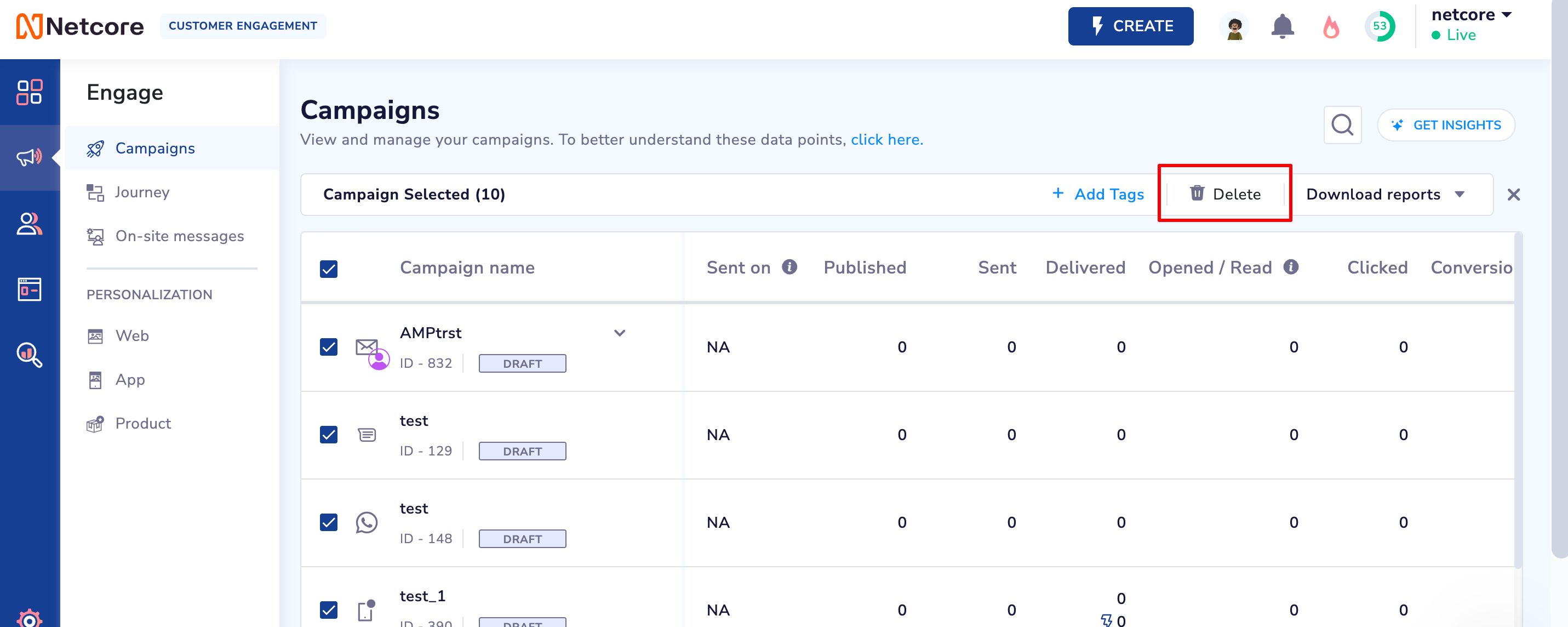 Only campaigns in 'Draft' status can be deleted in bulk. Even if users select all campaigns, only drafts will be considered for deletion.
