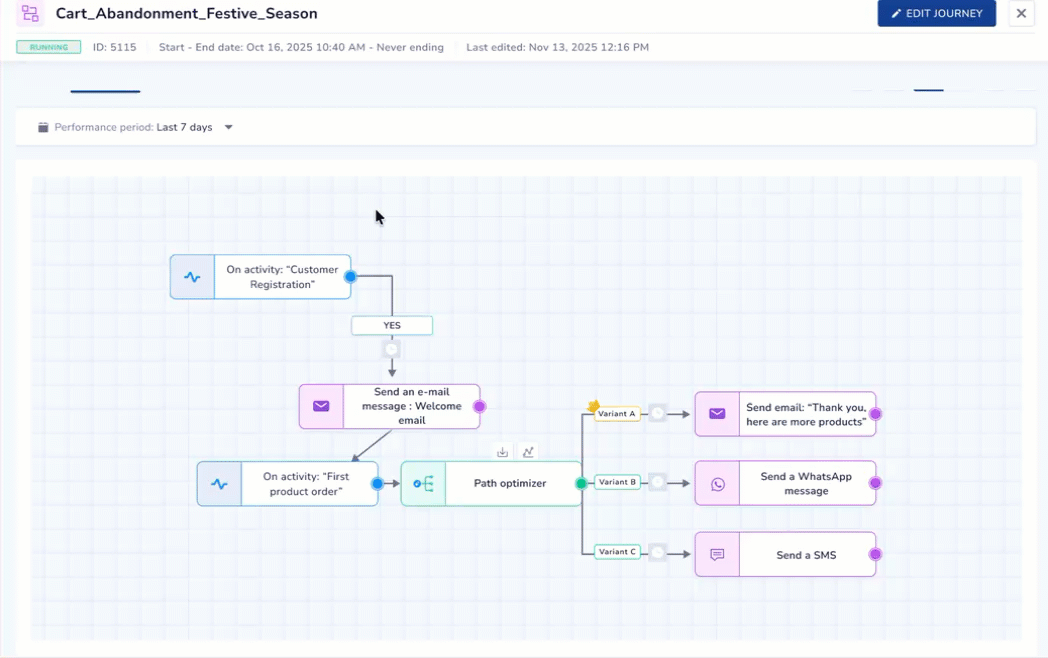 It automatically identifies which path (Email, SMS, WhatsApp, and so on.) is performing best and routes more users toward the winner to maximize your ROI on the fly.